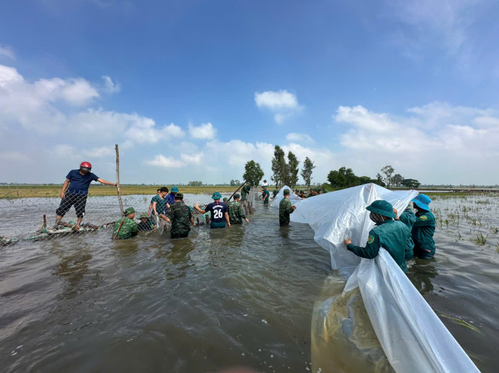 Cùng ngày, tại xã Vĩnh Châu, lực lượng dân quân tiếp tục hỗ trợ người dân ấp Bốn gia cố đoạn đê bao dài 2,2km, nhằm bảo vệ 86ha lúa đang trong giai đoạn đầu sinh trưởng.